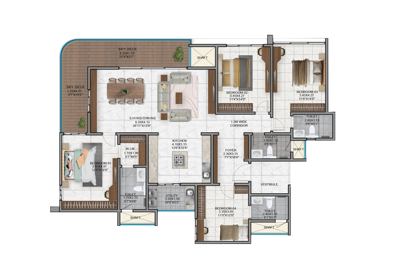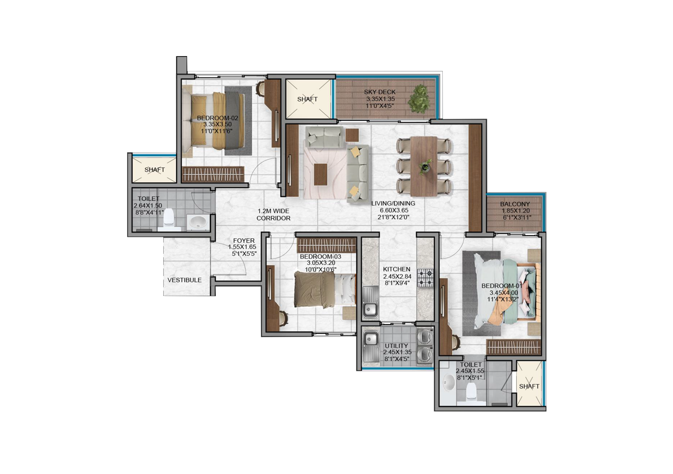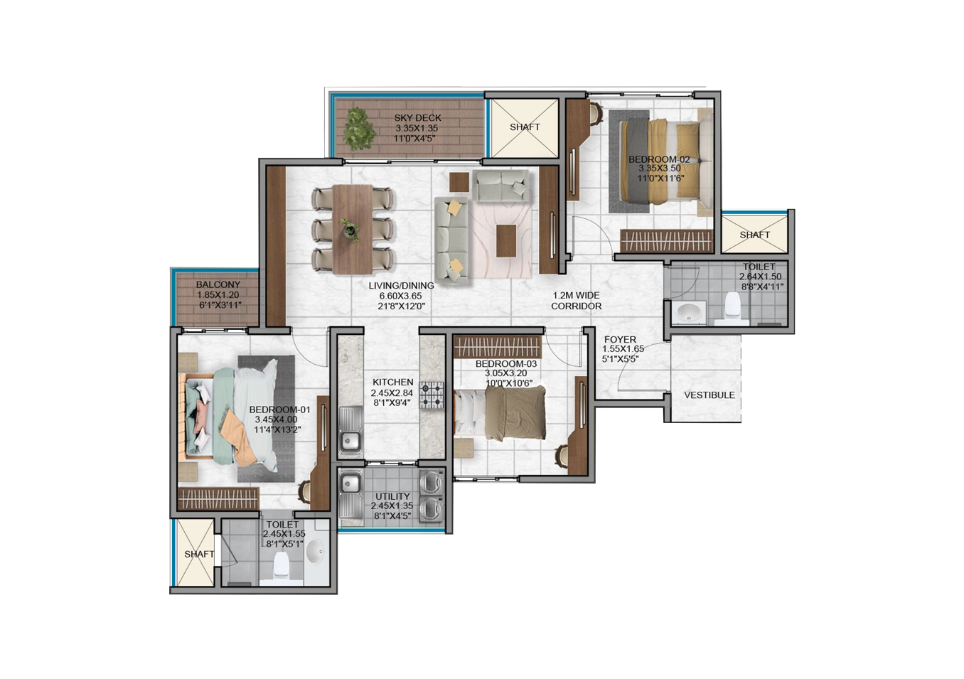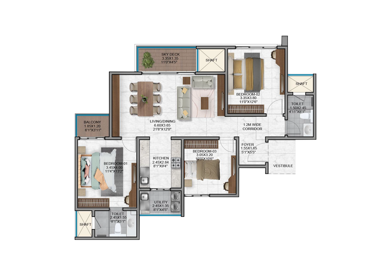 - Vitrified tiles in the foyer, living, dining, corridors and all bedrooms.