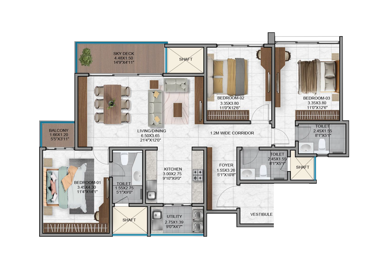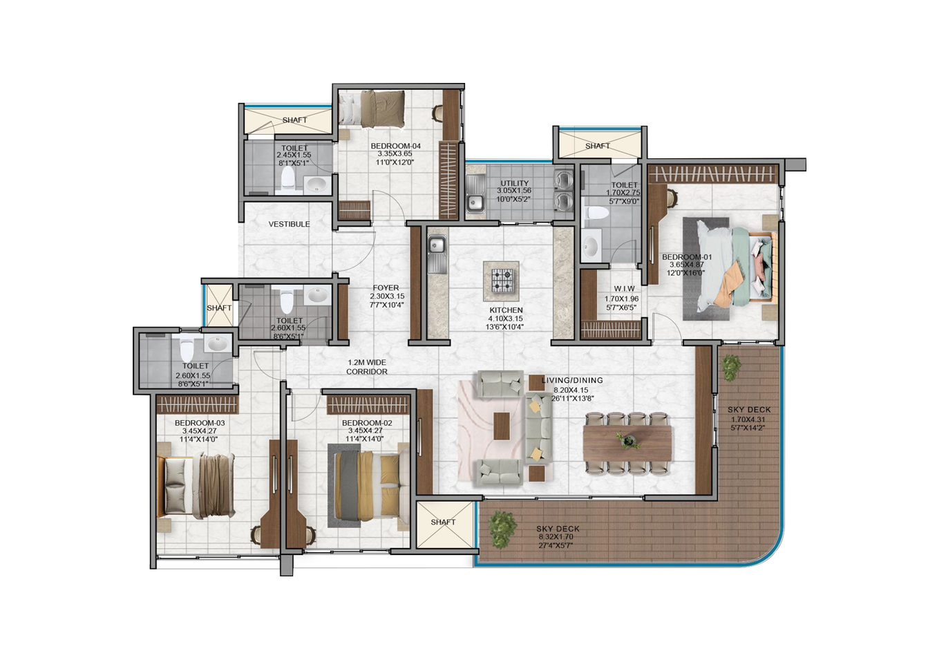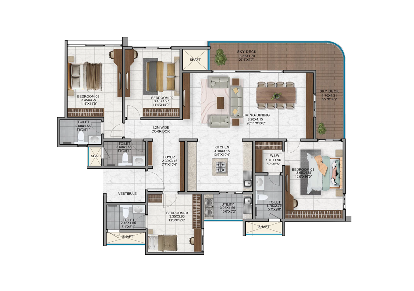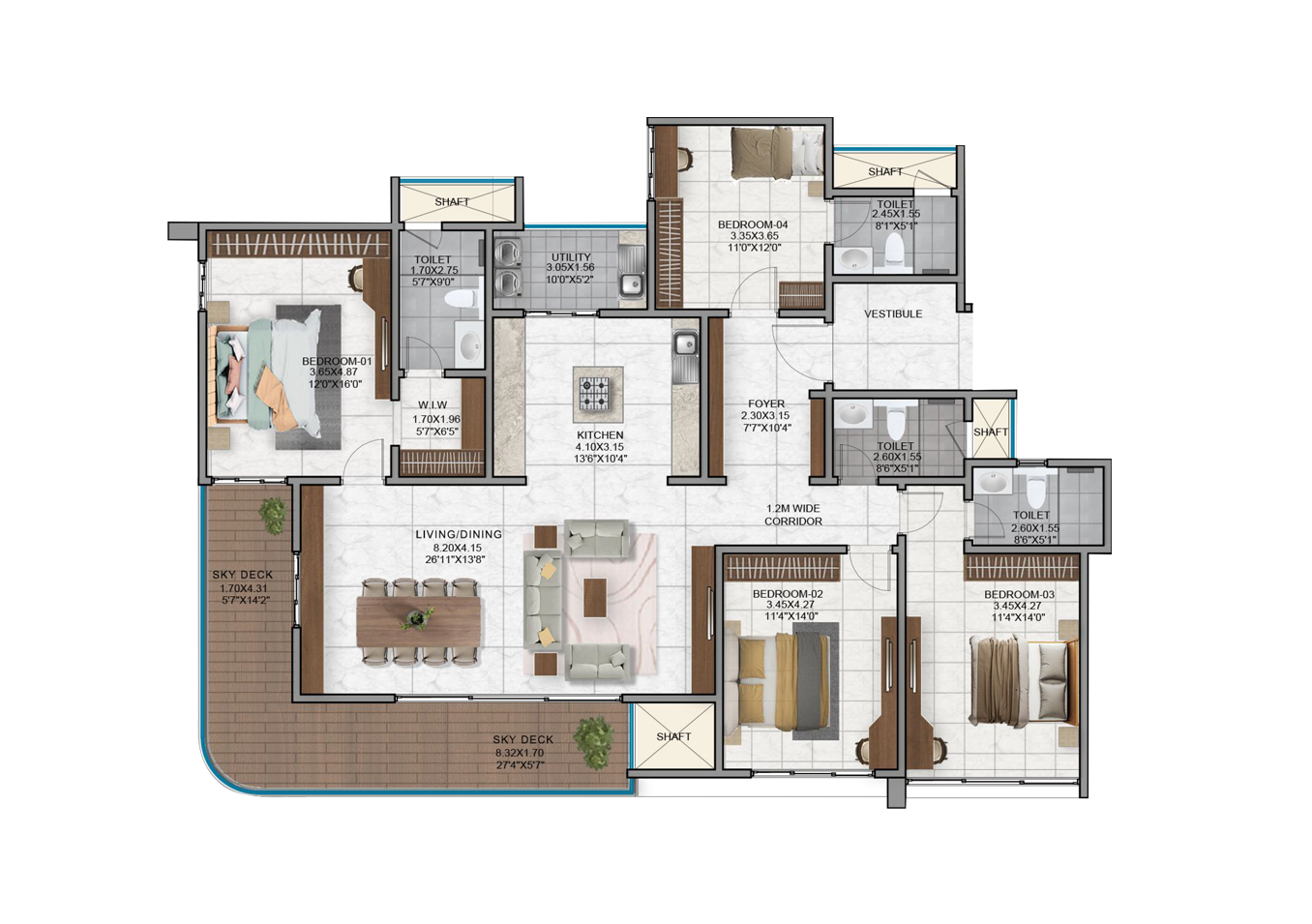 - Vitrified tiles in the foyer, living, dining, corridors and all bedrooms.