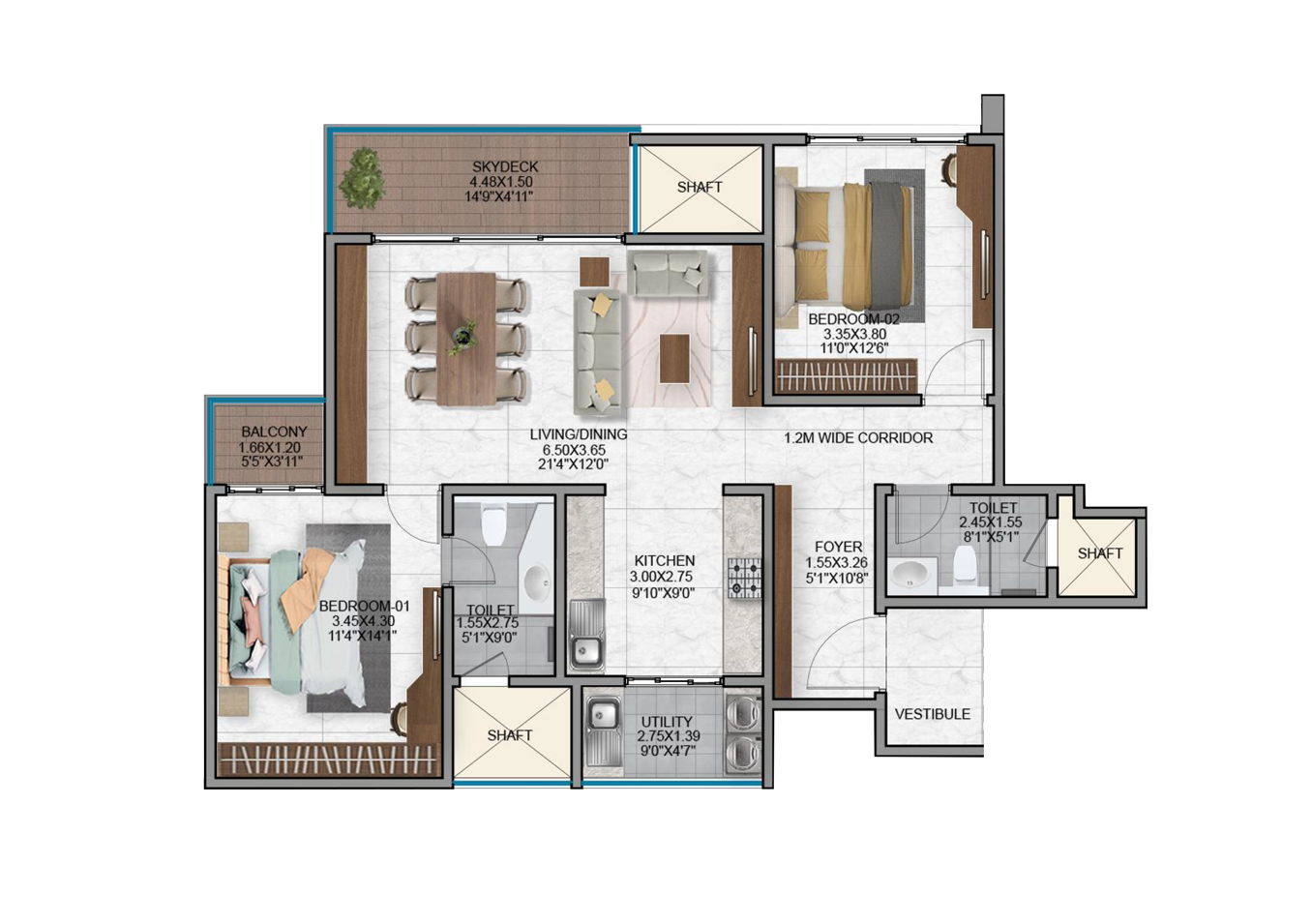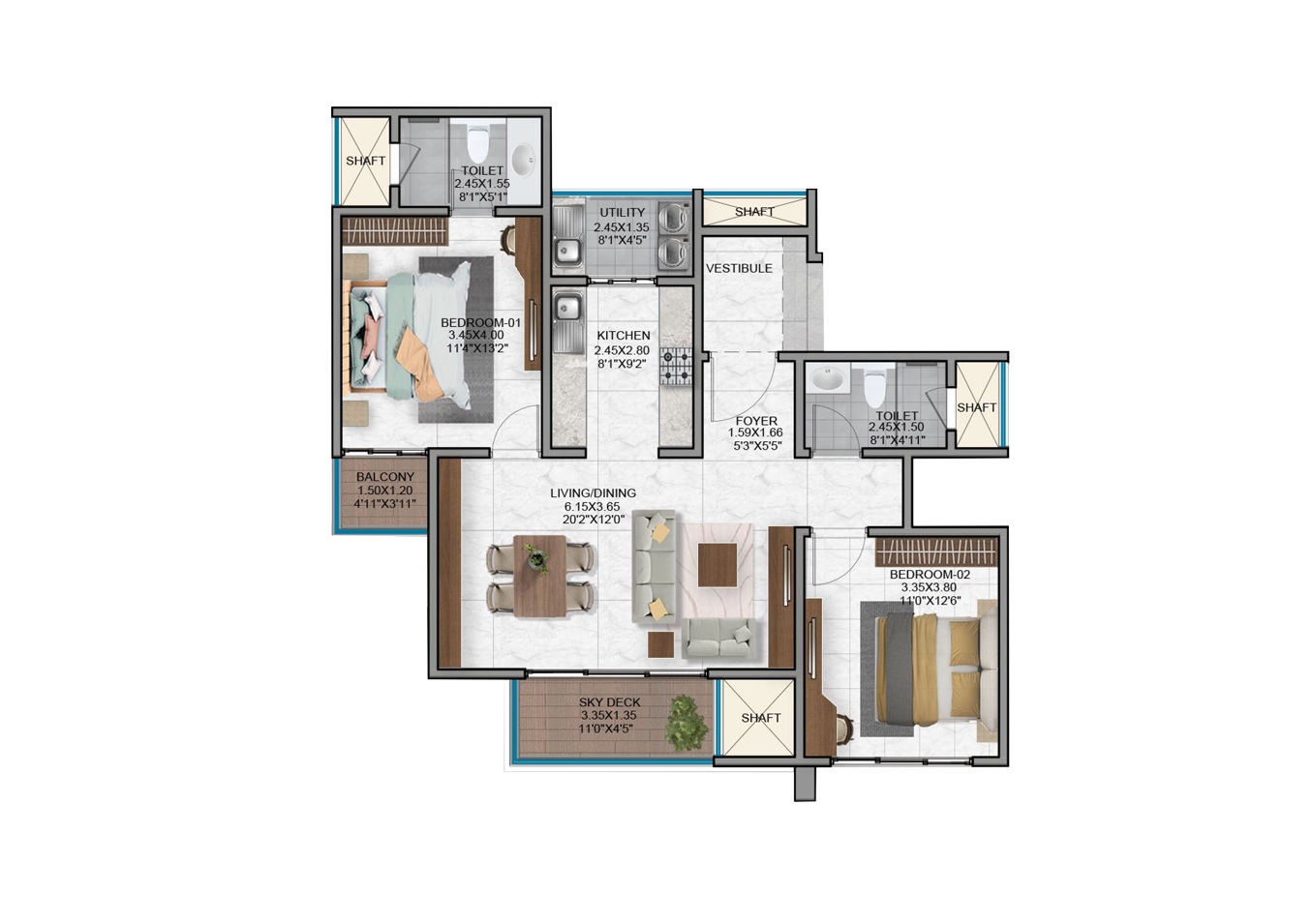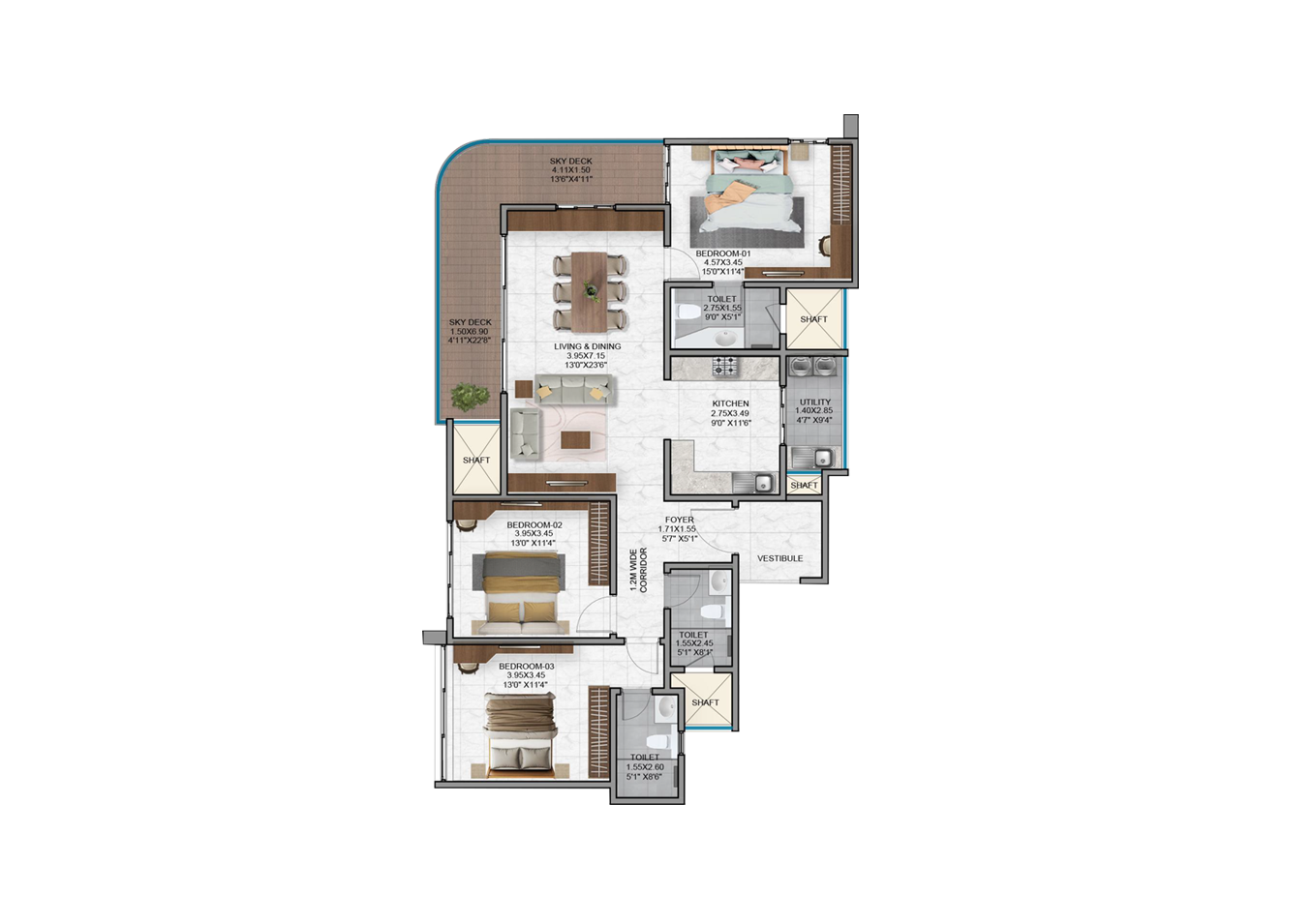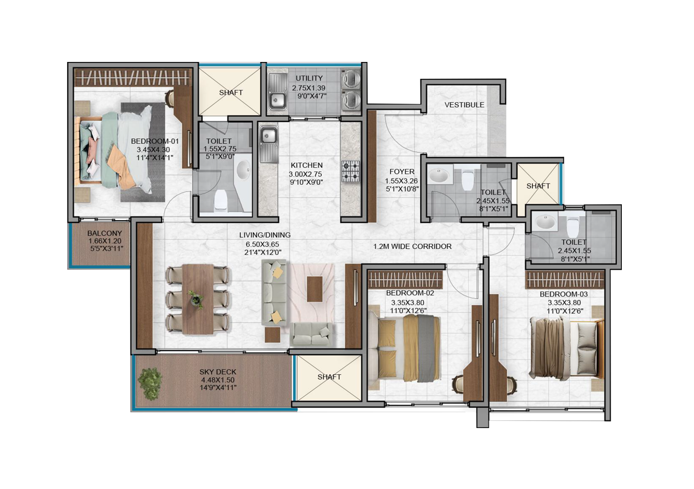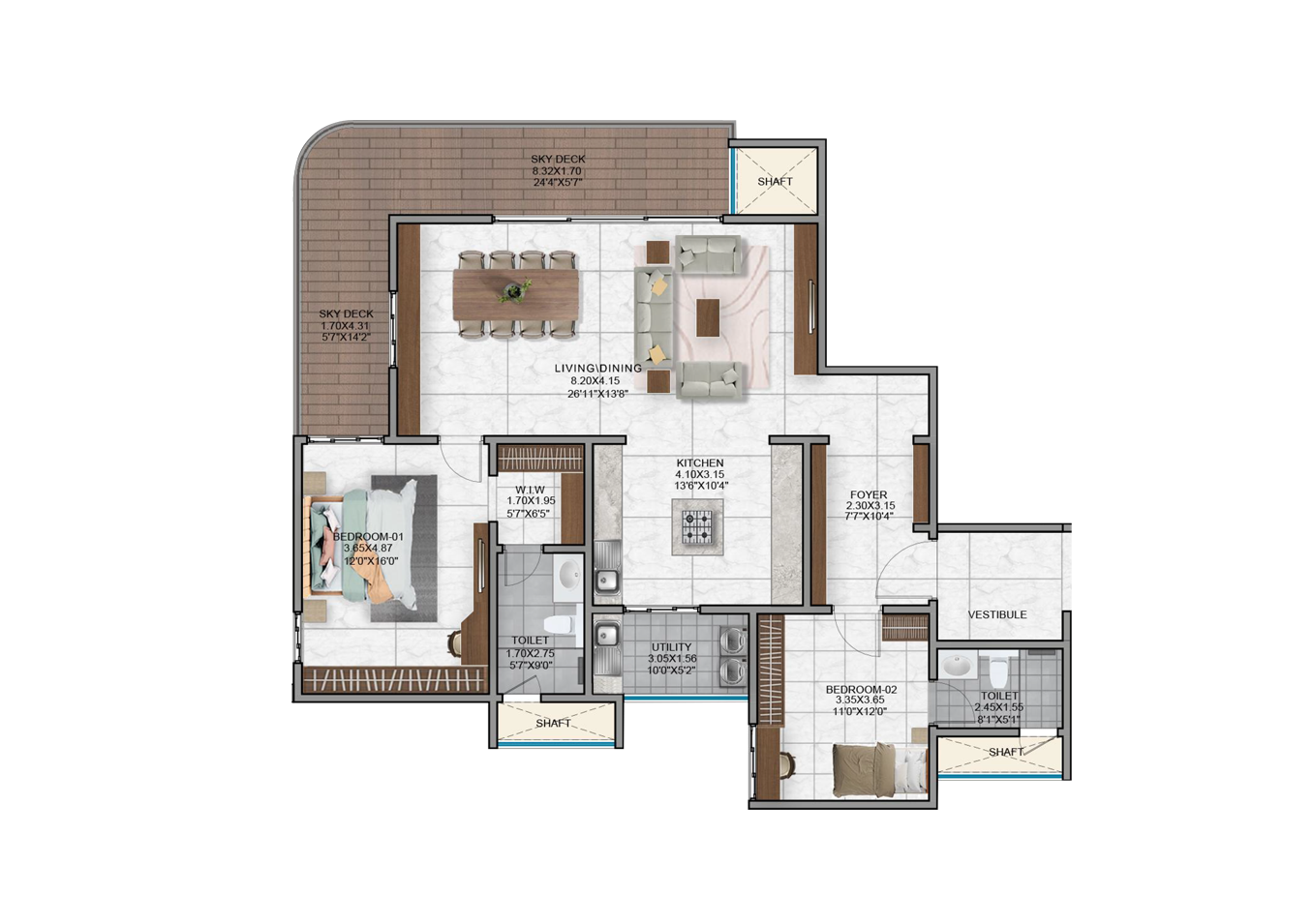 - Vitrified tiles in the foyer, living, dining, corridors and all bedrooms.