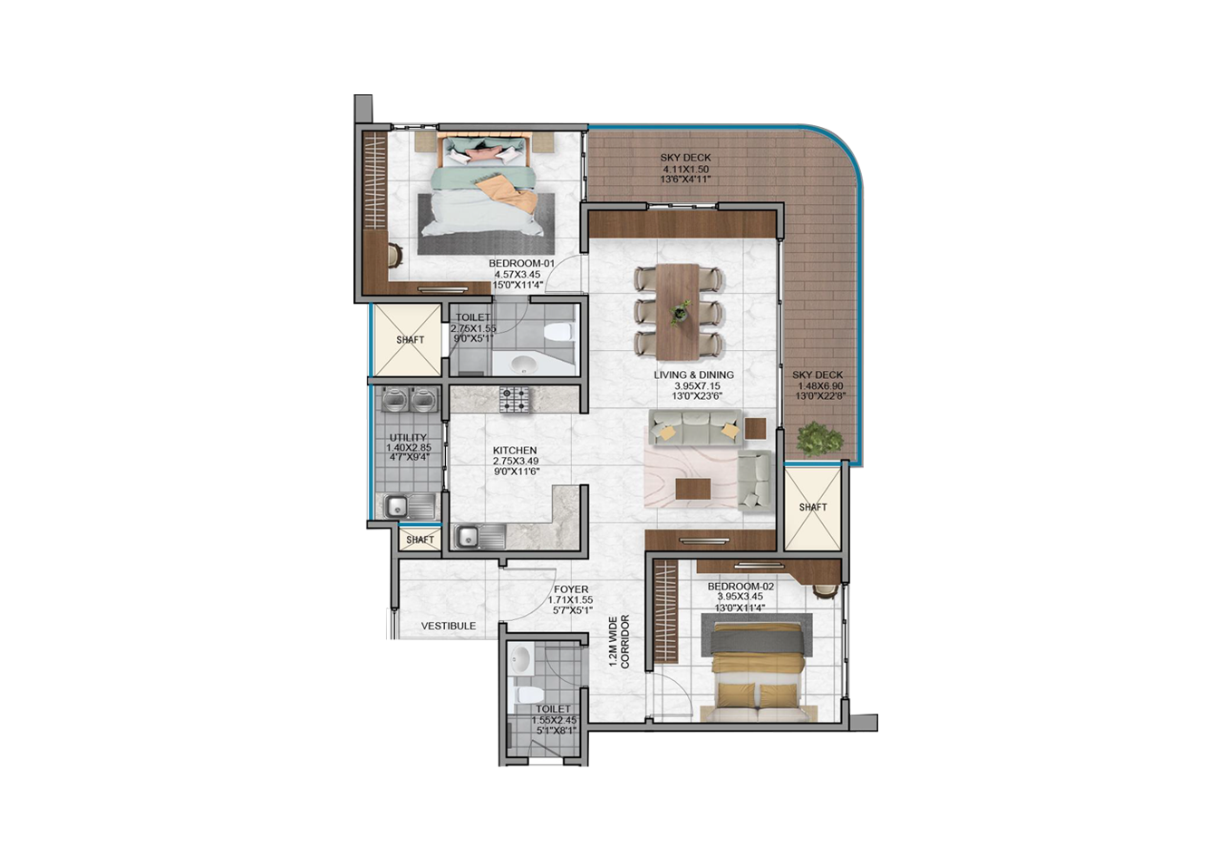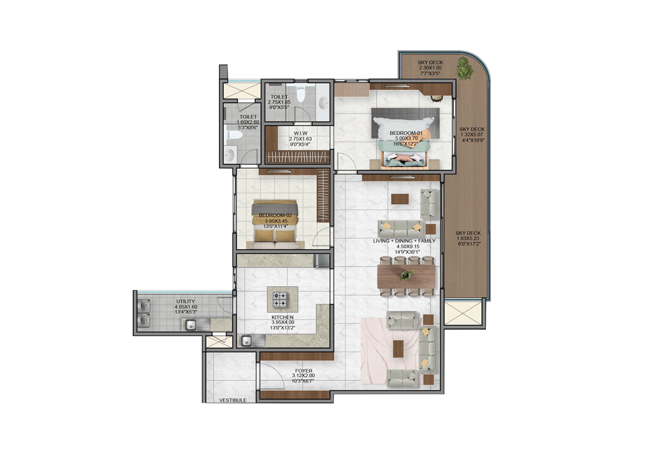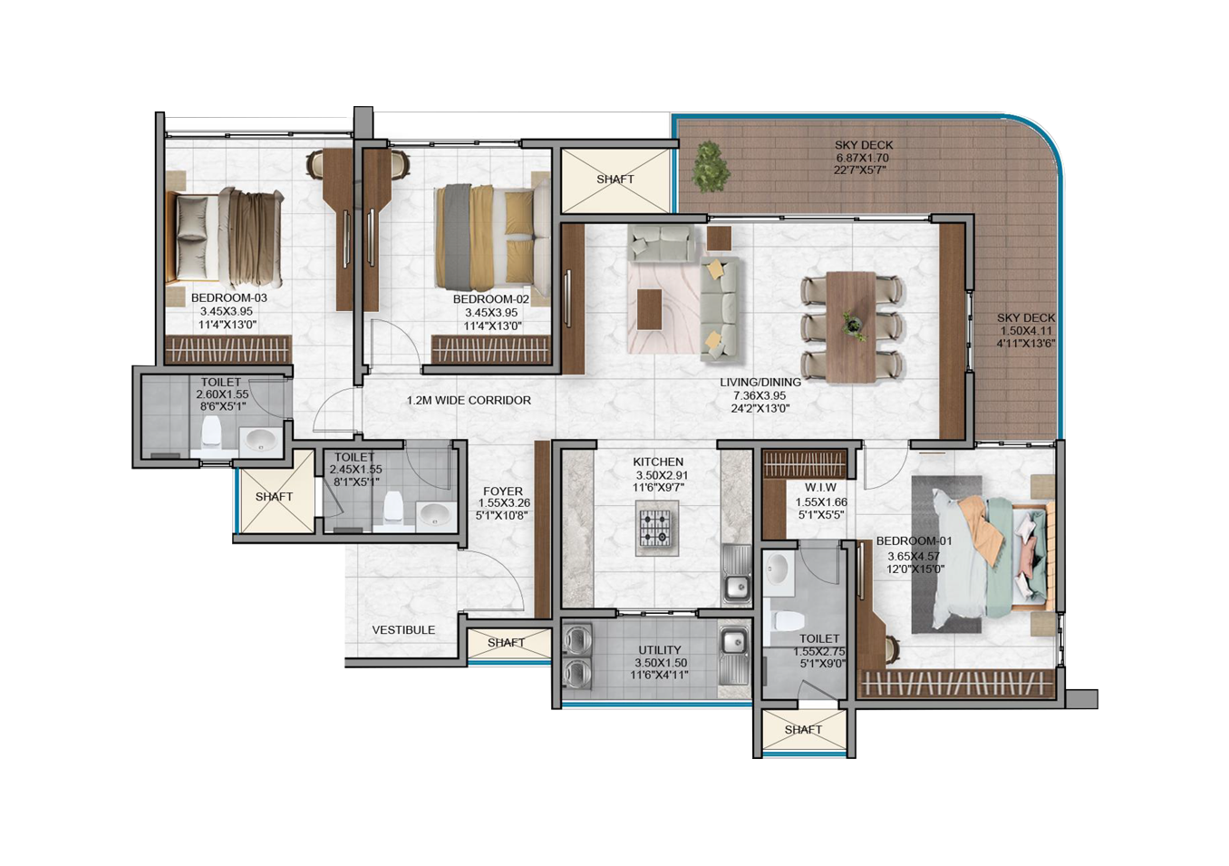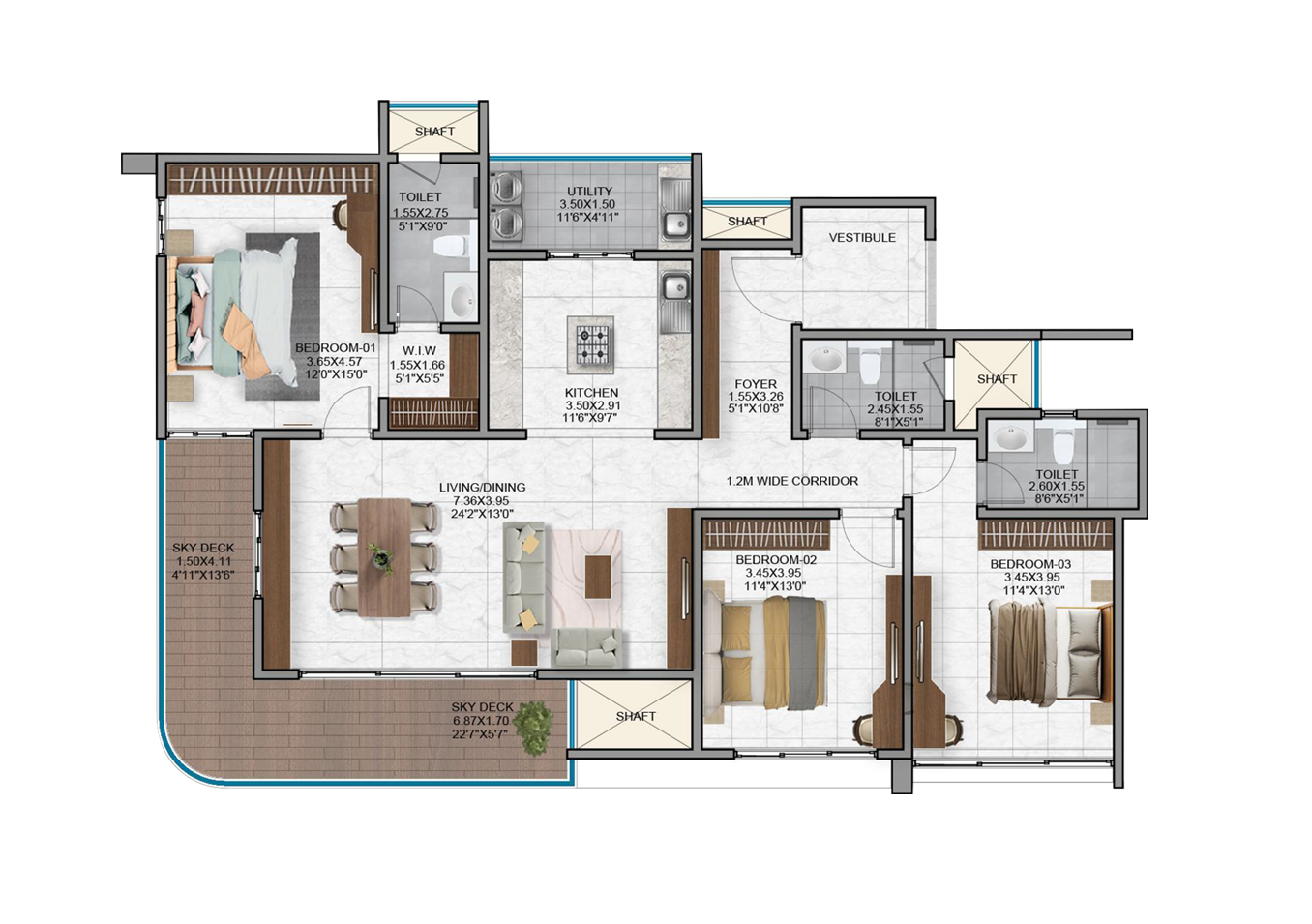 - Vitrified tiles in the foyer, living, dining, corridors and all bedrooms.